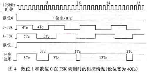 而位宽的变化则与调制方式有关。当采用NRZ码FSK调制时,发现位0和位1碰撞时,其合成波形的位宽有了比较明显的变化,图4所示是其碰撞情况时序图,图中数位0为FC/8,数位1为FC*10。